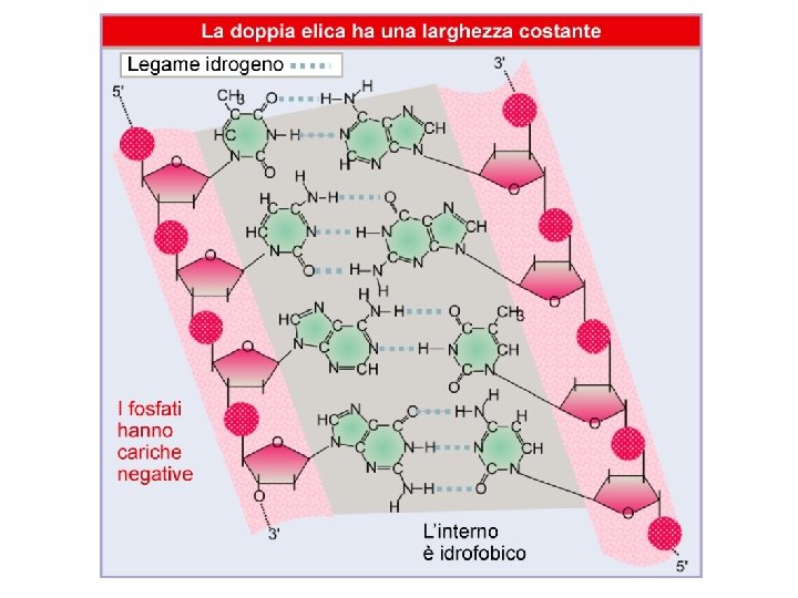 L’appaiamento delle basi implica la formazione di legami idrogeno H citosina N H N O N sugar H O H CH 3 timina H sugar N H N N H O N N N adenina N sugar guanina N sugar