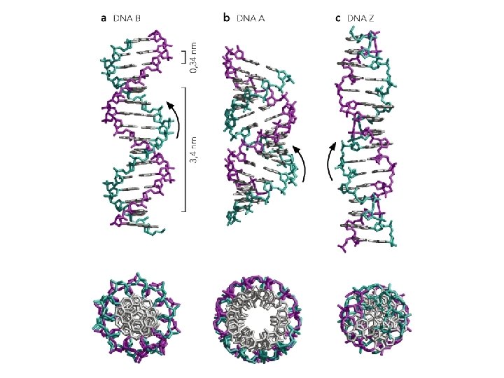 Gli acidi nucleici possono formare vari tipi di doppia elica Elica Coppie di basi per giro Rotazione tra due basi Diametro B 10 (10, 4) 36 (34, 6) 20 (19) A 11 32, 7 23 Z 12 -30 18