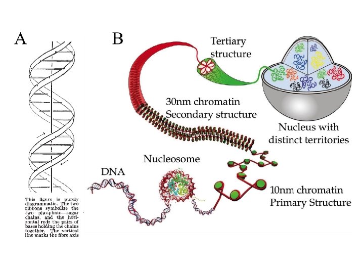 Nucleosomes Basic unit of DNA packaging in eukaryotes, consisting of a segment of DNA wound in sequence around eight histone protein cores v Two molecules each of H 2 A, H 2 B, H 3, and H 4 form the structural core of the individual nucleosome “beads” v Around this core, a segment of the DNA double helix is wound nearly twice, forming a negatively supertwisted helix