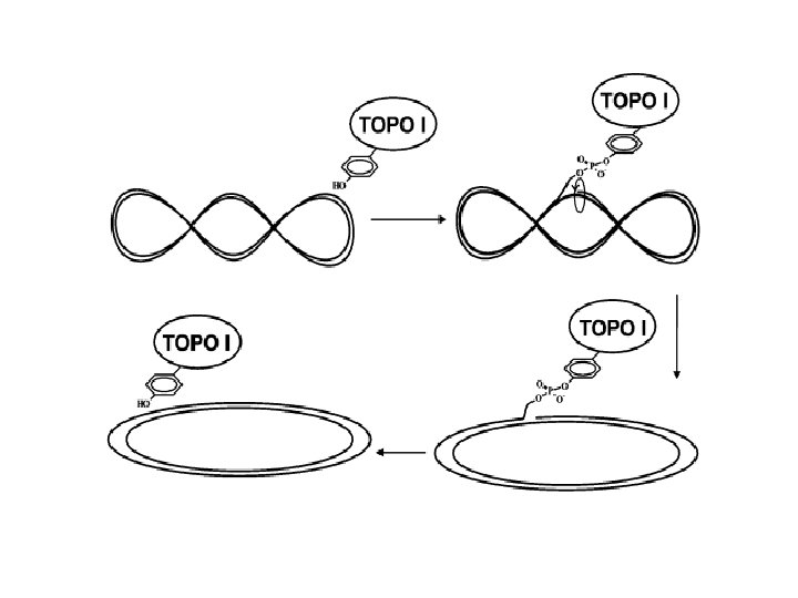 • Cells rely on enzymes to change the supercoiled state of a DNA duplex • These enzymes are called Topoisomerases because they change the topology of the DNA • Cells contain a variety of topoisomerases, which can be divided into two classes • Type 1 Topoisomerases change the supercoiled state of a DNA molecule by creating a transient break in one strand of the duplex • The enzyme cleaves one strand of the DNA and then allows the intact, complementary strand to undergo a controlled rotation, which relaxes the supercoiled molecule
