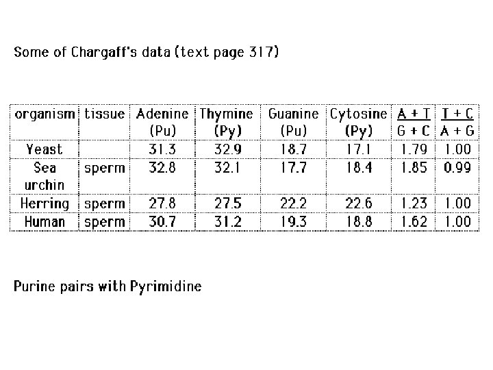 Edwin Chargaff Scopre che la quantità di DNA varia da un organismo all’altro ma……… RESTA COSTANTE IL RAPPORTO: ADENINA – TIMINA CITOSINA - GUANINA