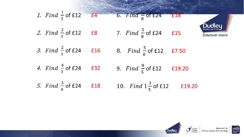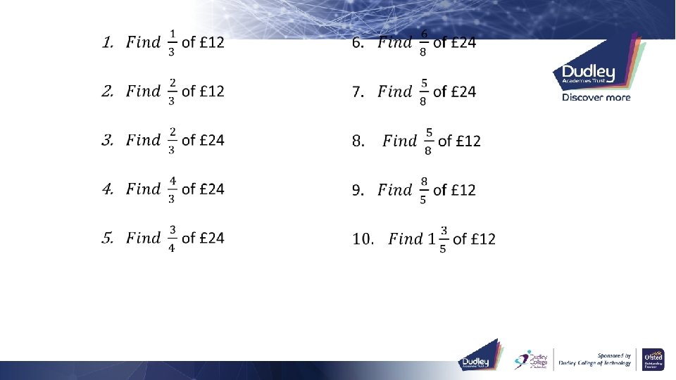 Connect Solve the following: 3 x 20 5 5 of 24 8 4 of 14 7 4 of 25 5 3 x 40 10 1) Amy had £ 240. 1/6 of her money was spent on a dress. 1/2 of her money was spent on a pair of shoes. How much money was left? 2) A School has 1200 pupils 575 of thee are girls. 2/5 of the girls like sport 3/5 of the boys like sport. Work 2) Some children were at summer school. ��/�� " of "them were girls. If there were 40 girls at out the total number of pupils in the school who like sport. summer school. How many boys were there?