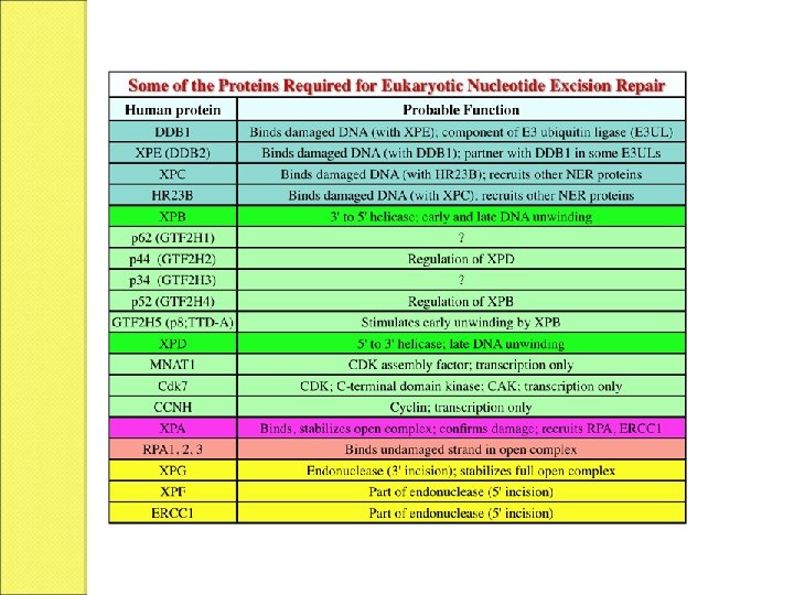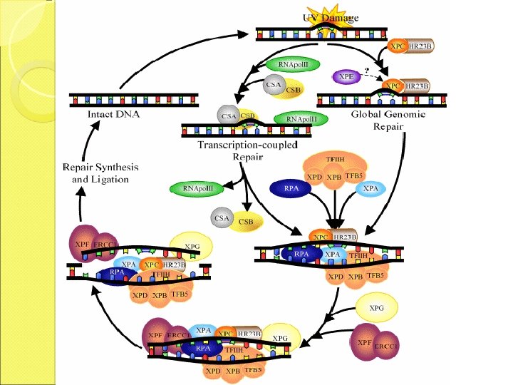 2. Nucleotide excision repair (NER), which recognizes bulky, helix-distorting lesions such as pyrimidine dimers and 6, 4 photoproducts. A specialized form of NER known as transcriptioncoupled repair deploys NER enzymes to genes that are being actively transcribed.