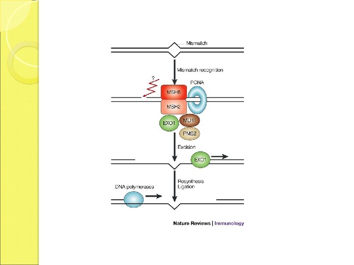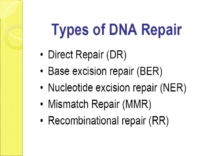 3. Mismatch repair (MMR), which corrects errors of DNA replication and recombination that result in mispaired (but undamaged) nucleotides.