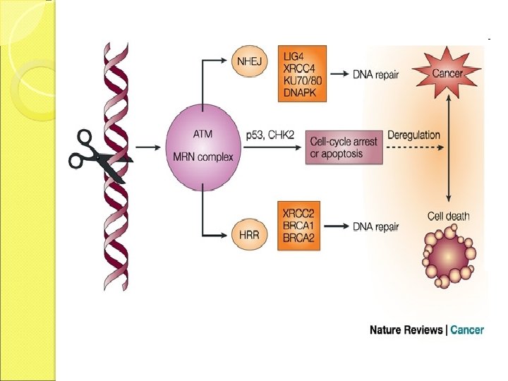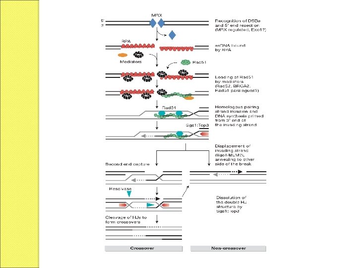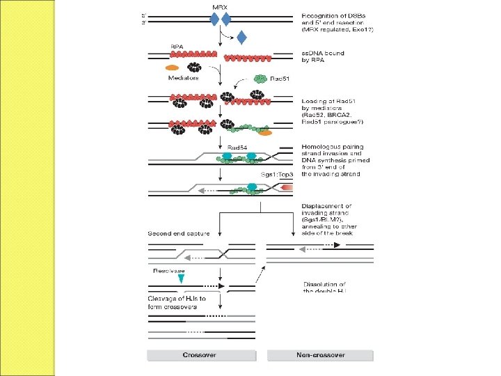 Double-strand breaks (DSBs), in which both strands in the double helix are severed, are particularly hazardous to the cell because they can lead to genome rearrangements. Various mechanisms exist to repair DSBs: non-homologous end joining (NHEJ), recombinational repair (also known as template -assisted repair or homologous recombination repair