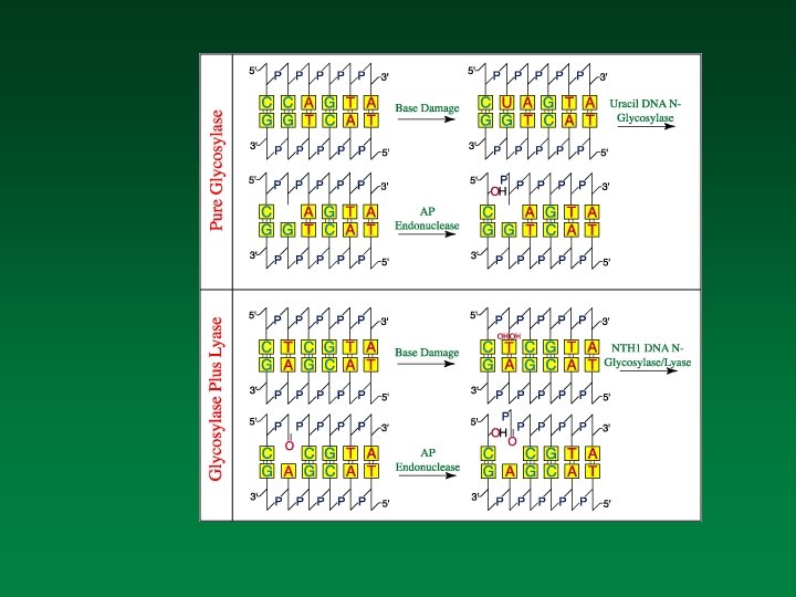 Why repair DNA? Replication error • 1. Errors in DNA replication • 2. Endogenous DNA damage and mutagens • 3. Environmental insults to DNA • 4. Un-repaired damage leads to: • -mistakes in RNA/protein synthesis • -inherited as genetic alteration-a mutation • -death OH. d. UTP UV hn H+ m. C TT P/P 8 -oxo. G U Depurination All of these events are rare, but the number of bp in each nucleus is very large so the total frequency is significant.