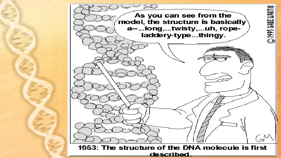 A HISTORY OF DNA • (1928) Frederick Griffith • Discovers that a “transforming factor” changes harmless bacteria into deadly bacteria • (1952) Rosalind Franklin • Takes x-ray photographs of DNA • (1953) James Watson and Francis Crick • Use Franklin’s images to describe the structure of DNA • (1962) Watson, Crick, and Wilkins win the Nobel Prize, Franklin has already died from cancer (1958) so she does not get recognition