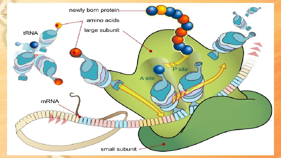 Translation 1. Translation begins when a ribosome attaches to the beginning of an m. RNA molecule 2. A t. RNA molecule carrying an amino acid matches up to a complementary triplet on m. RNA on the ribosome 3. The ribosome attaches one amino acid to another as it moves along the m. RNA molecule 4. The t. RNA molecules are released after the amino acids they carry are attached to the growing chain of amino acids 5. The ribosome completes the translation when it reaches the end of the m. RNA strand the newly made protein molecule