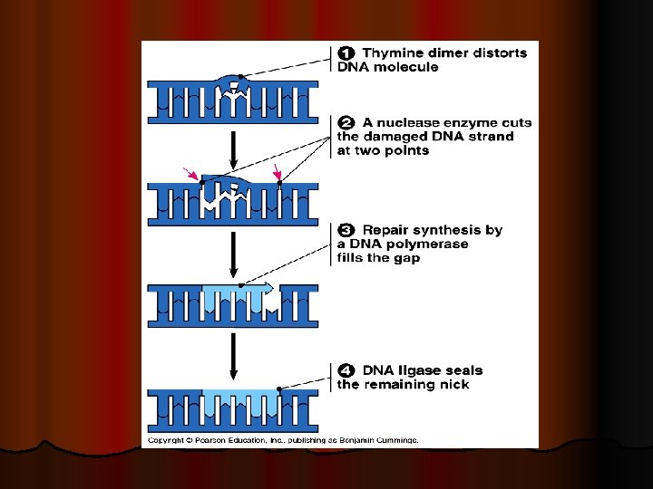 The DNA can repair itself! l DNA Polymerase proofreads first. l Mismatch Repair: Sometimes nucleotides are missed and the cell uses special enzymes to fix incorrectly paired bases. l Nucleotide Excision Repair: A nuclease cuts out the damage DNA and the gap is filled with the right nucleotides. l How can DNA be damaged? l What is a “thymine dimer”?
