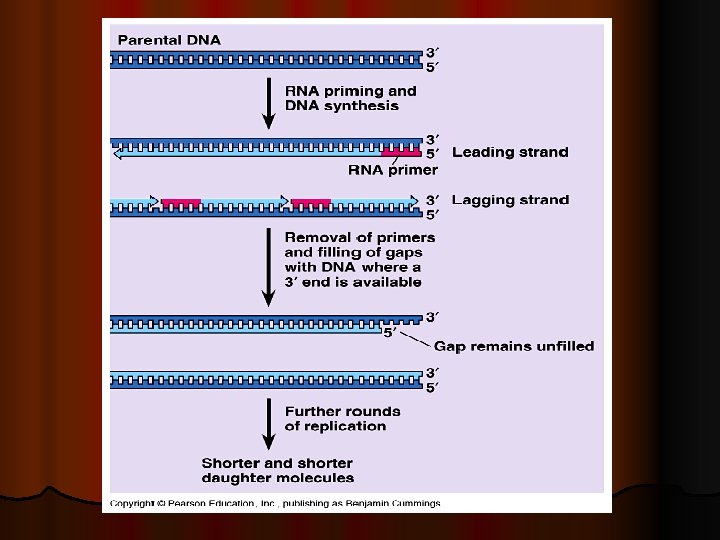 What is the purpose of a telemere? l THE PROBLEM: DNA can only be added to 3’ end – how to finish at 5’? Gaps are left and ends become shorter each time l THE SOLUTION: Telemeres do not contain genes but repeated nucleotide sequences (TTAGGG). As a result, as the chromosomes shortens only the repeated units shorten (telemere) rather than the genes!!!