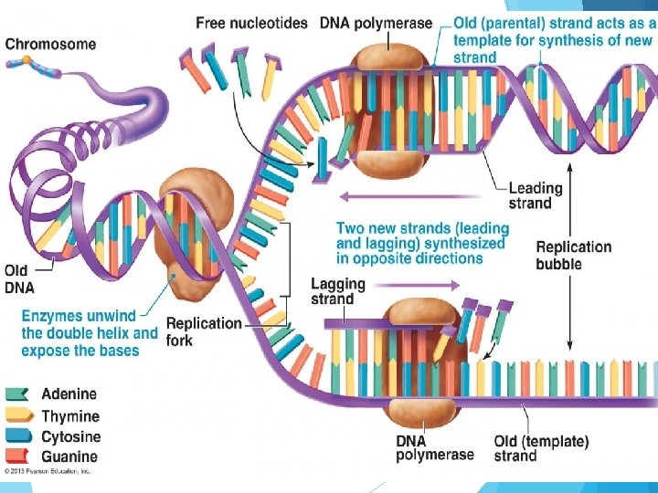 DNA Replication Two strands of the DNA molecule open forming replication forks New strands grow at the forks 5’ 3’ 3’ Parental DNA Molecule Replication Fork 5’