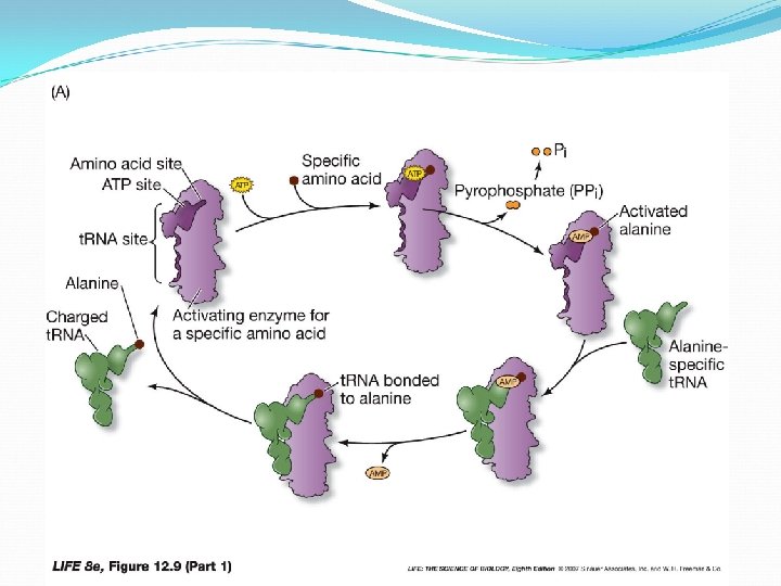 Aminoacyl-t. RNA synthetases Attaches amino acids to t. RNAs Their three-part active sites bind: a specific amino acid ATP a specific t. RNA, charged with a high-energy bond High-energy bond provides energy for making a peptide bond