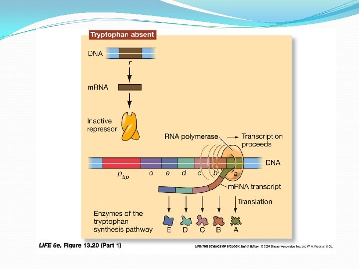 Regulation of trp Operon A protein is repressible if synthesis can be turned off by a biochemical cue (e. g. , ample supply of that protein) The trp operon controls synthesis of tryptophan — it is a repressible system Gene is normally “on”, transcribing m. RNA and synthesizing structural proteins