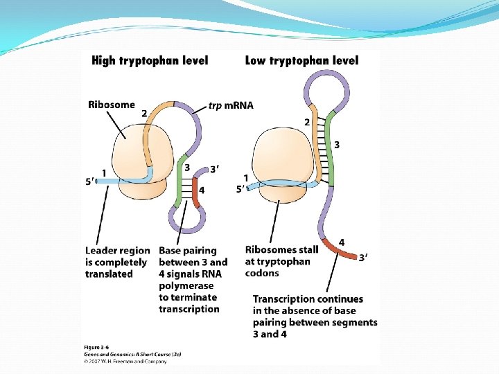 The Attenuation in trp operon • Attenuation is a method of regulating transcription by preventing complete m. RNA synthesis. – The 5’ end of trp operon m. RNA, the leader region (region 1) is rich in tryptophan codon. – When tryptophan is available, the translation of this region occurs. – As this happens, the trp m. RNA forms a stem-loop structure between region 3 and 4, transcription is attenuated. – When the tryptophan level drops, the attenuation is relieved. – The ribosome is stalled at the leader sequence, different stem-loop forms (2 and 3), allows the transcription to continue.
