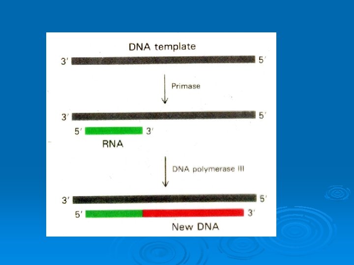 Primaz (DNA G proteini): S pesifik RNA polimeraz, DNA kalıbına tamamlayıcı ve ters yönde paralel öncül RNA molekülünün, yaklaşık 10 nükleotid uzunluğundaki zincirini, sentezler. Kısa RNA dizisi, artçıl zincir üzerinde, replikasyon çatalında devamlı sentez edilir. 28