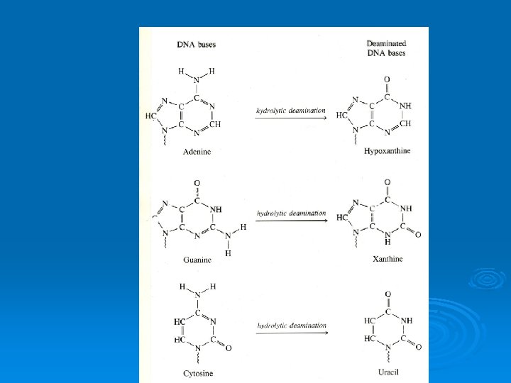 Baz Kesip Çıkarma Onarımı Urasili oluşturmak üzere , amino grubunun uzaklaştırıldığı, sitozin örneğinde olduğu gibi, DNA molekülündeki bazlar, kendiliğinden veya alkillendiren ve deanimasyon yapan bileşiklerin etkisi ile değişebilmektedir. Nitrozaminler, nitritler ve nitratlar gibi öncül maddelerden hücreler tarafından oluşturulan nitroz asid, sitozin, adenin ve guaninden 69. amino grubunu uzaklaştırır