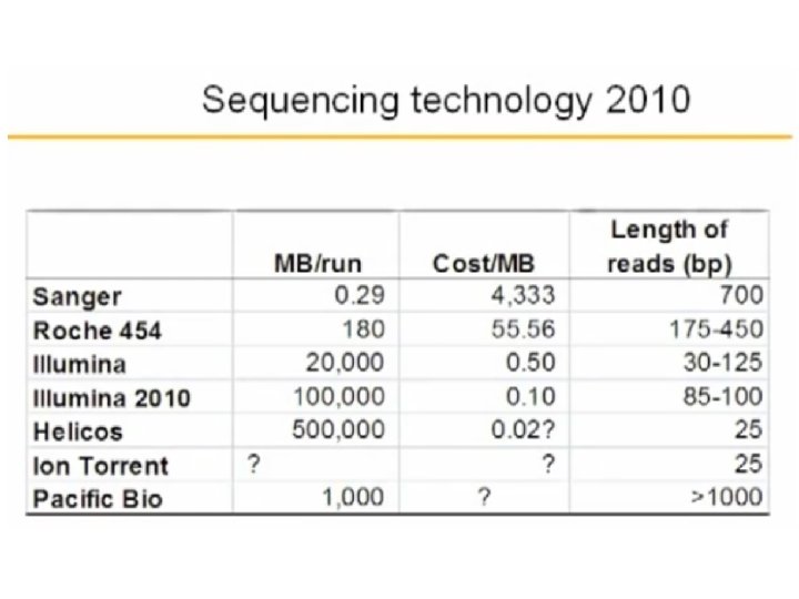 DNA sequencing determining the order of nucleotides in DNA – Sanger (di-deoxy) 600 -1000 bp – Next-Generation Sequencing • 2 nd generation • 3 rd generation 454 -Pyrosequencing • Solexa/Illumina Secuencing • True Single Molecule Sequencing • Ion Torrent