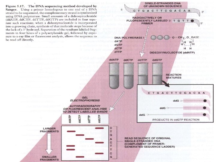 The principles • Partial copies of DNA fragments made with DNA polymerase • Collection of DNA fragments that terminate with A, C, G or T using dd. NTP • Separate by gel electrophoresis • Read DNA sequence