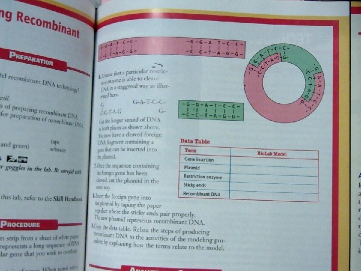 Plasmid activity p. 354 -355 • Tape the ends of the shorter strip together. • This is the plasmid • Cut the longer strip of DNA in 2 places at the palindrome GIGATCC. This is the foreign DNA. Cutting it represents restriction enzymes. • Cut the plasmid in the same way. • Insert the foreign gene into the plasmid and tape together.