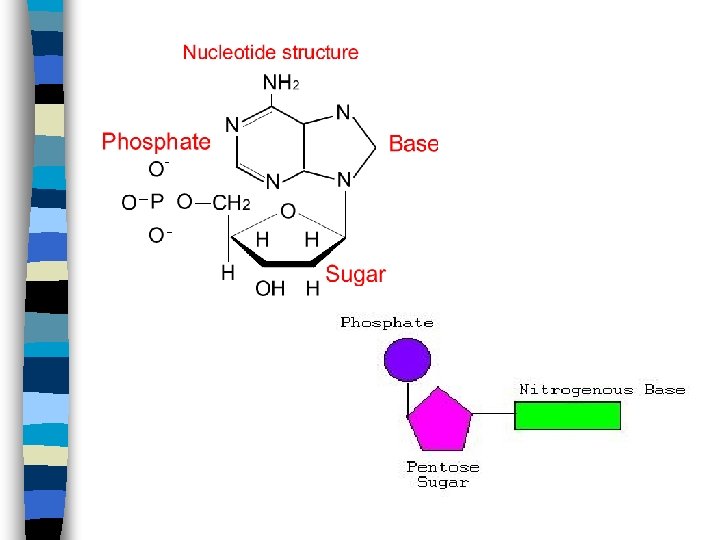 Structure of DNA After isolating DNA and RNA, Levene determined that both molecules are made up of nucleotides (in long chains) n Nucleotide is composed of: n – 5 -carbon sugar (deoxyribose in DNA, ribose in RNA) – Phosphate – Nitrogen base (4 different types) The 4 nitrogen bases belong to two chemical groups called purines and prymidines n Purines = Adenine (A) and Guanine (G) n Prymidines = Thymine (T) and Cytosine (C) n