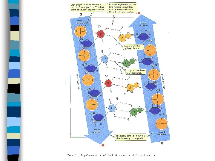 Structure of DNA n The two strands that make up DNA are not identical, they are complementary to eachother – n This is due to the complementary base pairs of A-T and C-G The two strands are also antiparallel – – The phosphate bridges run in opposite directions in the two strands Each end of a double stranded DNA molecule contains the 5’ end of one strand the 3’ end of the complementary strand
