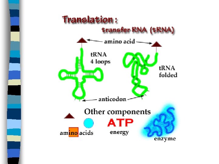Translation is the next stage of protein synthesis n Involves translating codons found on the m. RNA into a chain of amino acids (to form a protein) n Transfer RNA, t. RNA is made up of a single strand of RNA that folds into a clover-leaf shape n – One lobe contains the anticodon, three nucleotides that are complementary to the m. RNA codon – At the opposite end is a binding site for the amino acid that corresponds to the codon n Ribosomal RNA, r. RNA is a linear strand of RNA that remains associated with the ribosomes