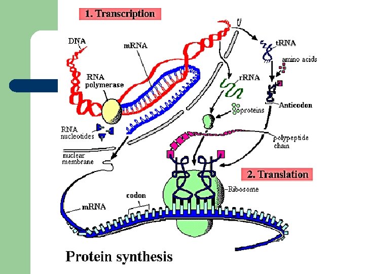 Protein Synthesis l l Start: Ribosome binds to m. RNA at start codon (AUG) Elongation: – – – l t. RNA complexes bind to m. RNA codon by forming complementary base pairs with the t. RNA anticodon The ribosome moves from codon to codon along the m. RNA. Amino acids are added one by one Release: release factor binds to the stop codon