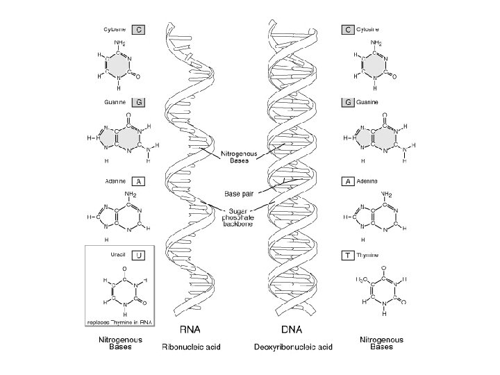 RNA • Tek zincirli polinukleotitdir • Pentoz; (5 C’lu Riboz), Primidin Timin (T) yerine Urasil; (U) bulunur • Formları; m. RNA, t. RNA, r. RNA, sn. RNA • Çekirdekçik, stoplazma ve ribozomlarda bulunur