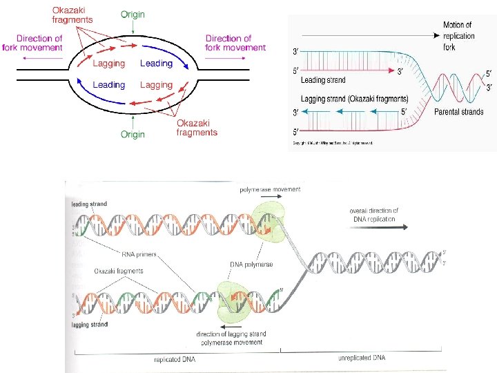 DNA Replikasyonunun Kesintili ve kesintisiz olarak gerçekleşir. DNA sarmalında zincirlerden birisi 5’-3’ iken diğer, 3’-5’ yönünde olduğu durumundadır. Bu durumda DNA Poly. III, DNA sentezini sadece 5’-3’ gerçekleştirebilir. Bu durumda replikasyon çatalı açıldıkça ve aşağı doğru hreket ettikçe sadece bir kol sürekli DNA sentezi yamaktadır. Bu zincire kesintisiz DNA zinciri (leading DNA strand denilmektedir. Diğer DNA zincirinde sentez için pekçok başlangıç noktası gereklidir. Dolayısıyla buda kesintili DNA sentezi yapılır. Okazaki ve ark. (1968) E. Coli de bakteriyofaj DNA sının replikasyonu sırasında yeni sentezlenen DNA’nın kalıp zincire H bağlarıyla tutunan 1. 000 -2. 000 nükleotidlik küçük parçalar halinde bulunduğunu göstermiştir. RNA primeri bu şekildeki herbir parçanın bir kısmını oluşturmaktadır. Okazaki parçaları denilen bu parçacıklar sentez devam ettikçe molekül ağırlığı artacaktır. (ökaryotlarda 100 -400 nukleotid) Kesintili DNA sentezinde, RNA primerlerini uzaklaştıracak ve okazaki fragmanlarını birleştirecek enzimlere gereksinim vardır. Poly I bu işten sorumludur. Bu parçalarda DNA ligaz ile birleştirilir.
