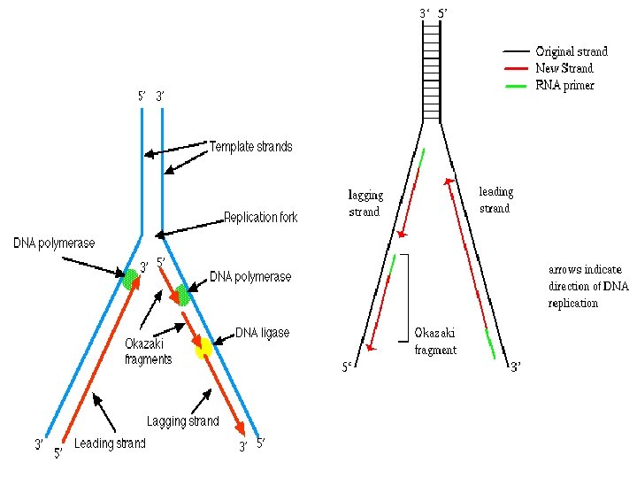 DNA sentezinin başlaması için RNA primerlerine gereksinim vardır Sarmal açıldıktan sonra sentez başlayabilir fakat DNA polimeraz III’ün polinükleotit zincirini uzatması için serbest 3’-OH grubu olan bir primer gereklidir. A) Kalıp DNA üzerinden, DNA’ya eşlenik olan kısa RNA parçası sentezlenir (5 -15 nukleotid uzunluğunda) B) RNA sentezi PRİMAZ adı verilen RNA polimerazın bir çeşiti tarafından katalizlenir. C) Primazın sentezi başlatması için serbest 3’ ucu gerekmez ve DNA poly. III bu RNA parçasını 5’ – deoksiribonükleotitleri takmaya başlayarak Dna sentezine başlatır. D) Daha sonra RNA primeri uzaklaştırılarak DNA kalır. Bu reaksiyon DNA poly 1 ile olur. Bu işlem bakteri, virüs ve çeşitli ökaryatik organizmalarda evrenseldir. Primozom, primer sentezi için gerekli reaksiyonlara katılan protein kompleksi.