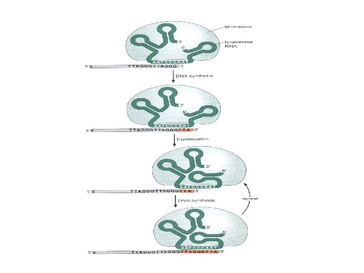 Telomeraz = protein + RNA d. NTP’lerin eklenmesi için kendi RNA’sını kalıp olarak kullanarak özel tek zincirli DNA dizilerinin 3’ ucunu uzatır. RNA’da telomer dizinin tamamlayıcısı olan nukleotid dizisi bulunur. Eşleşme, RNA kalıbının bir kısmını tek zincirli durumda tutacak (bir primer: kalıp bağlantı yeri yaratacak) şekilde meydana gelir. Protein kısmı ters transkriptaz enzimlerine benzer. RNA kalıbının ucuna DNA’yı ekler fakat RNA’yı kopyalamayı fazla devam ettirmez. Kalıp RNA DNA ürününden çözünür, telomerin son üç nukleotidiyle yeniden eşleşir ve bu süreç tekrarlanır.
