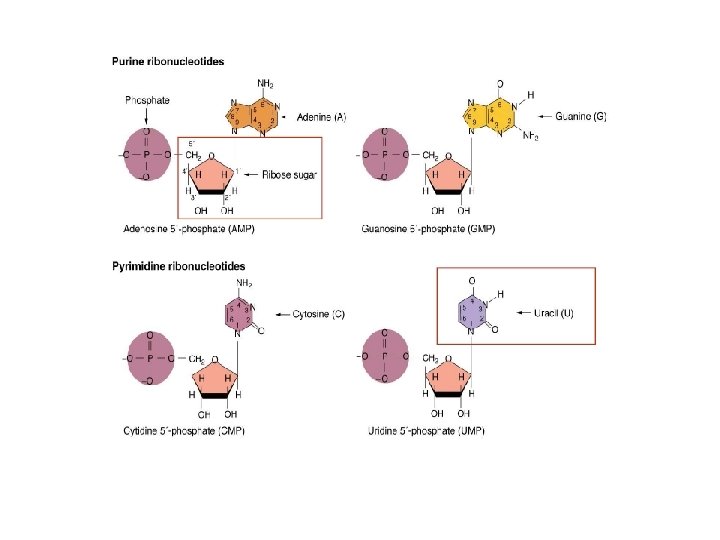 Nukleik asitlerin moleküler yapısı • İşlevi; bütün hucreler için kalitim bilgisi taşırlar • 5 C’lu şeker (Pentoz) – DNA (deoksiriboz), RNA (riboz) • N’lu baz – 9 atomlu-2 halkalı Purinler (A, G) – 6 atomlu-tek halkalı Primidinler (C, T, U) • Fosfat grubu