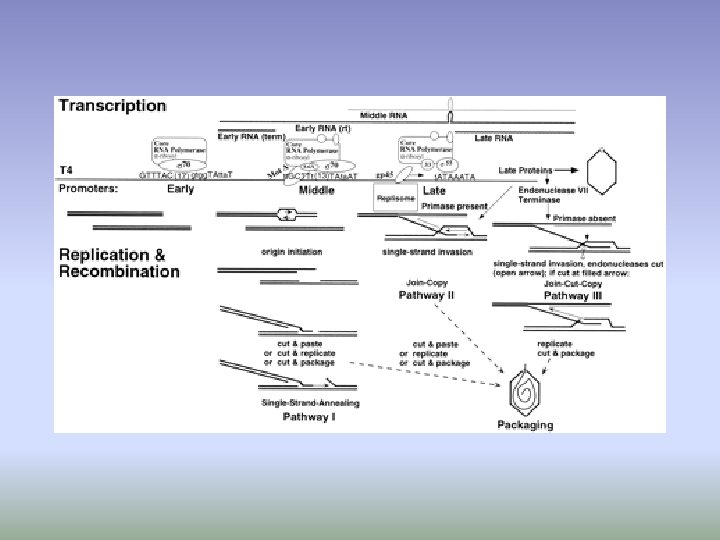 T 4 changes host RNA-P • RNA-P - 4 subunits plus sigma factor • IE uses host enzyme but at promotors that differ from E. coli (high affinity) • IE gene products – modifies (ADPr) RNA-P to recognize DE promotors – Antitermination – Nucleases (host DNA and t. RNA) – Membrane repair