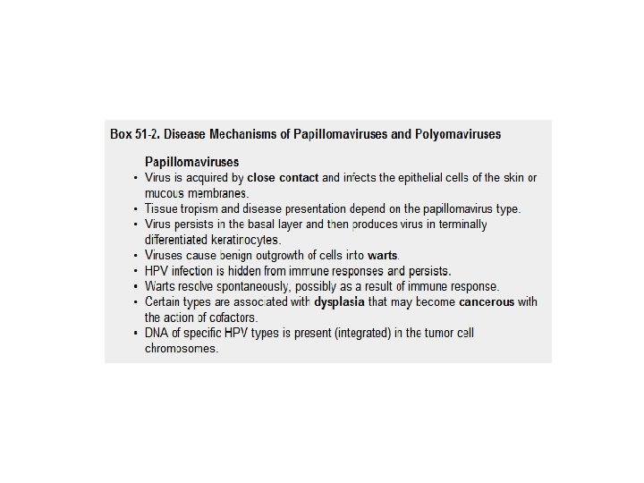 Papovavirus family: Papillomaviruses and Polyomaviruses • Papovavirus family (Papovaviridae) has been divided into two families, Papillomaviridae and Polyomaviridae. • Are capable of causing lytic, chronic, latent, and transforming infections, depending on the host cell. • Human papillomaviruses (HPVs) cause warts, and several genotypes are associated with human cancer (e. g. , cervical carcinoma).