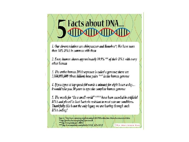 What is DNA? • Contains all genetic information of the entire organism • Located in the nucleus of all cells (with a few exceptions!) – mature red blood cells have no nucleus – sex cells have half the amount of genetic information (haploid) • A “full set” in humans is 46 chromosomes – Made up of 23 pairs (diploid)