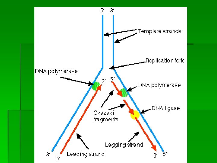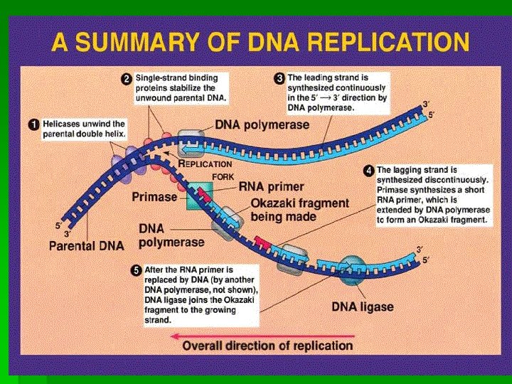 B. Lagging Strand § Replication away from fork § § § new strand CANNOT be made from 3’ 5’ (Replication runs downhill!) Construction on the lagging strand is much more complicated Discontinuous replication- new DNA is added in Okazaki fragments § § RNA primase lays down RNA primer (to get new strand started) Then DNA polymerase fills in the gap behind primer (puts new nucleotides at 3’ end) Once previous primer is reach, it is changed to DNA ligase connects fragments