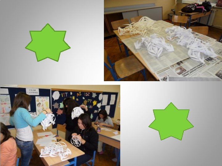 PROSINAC • učenici su tehnikom batika nacrtali jaslice te izrađivali ukrase za hol škole. • učenici su izrađivali pahuljice tehnikom izrezivanja iz papira.