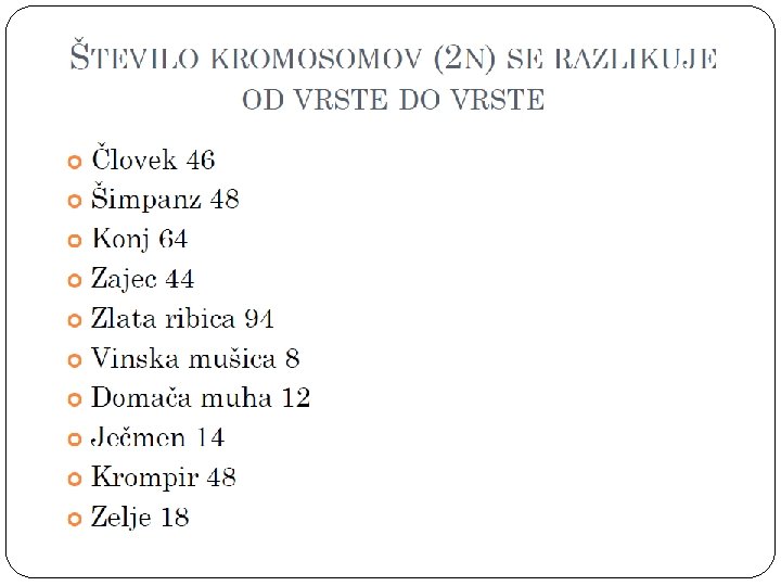 DNK § DNK se znotraj jedra nahaja v obliki kromatina = snov v celičnem jedru, sestavljena iz DNK in proteinov. § Med celično delitvijo se DNK tesno zvije (zgosti) in tvori kromosom. Vsak kromosom je sestavljen iz: Ø ene molekule DNK, v kateri je zapisana dedna informacija in Ø velikega števila beljakovinskih molekul, ki pomagajo vzdrževati zgradbo in delovanje kromosoma - npr. omogočajo zgoščevanje DNK. V našem telesu je 23 parov = 46 kromosomov.