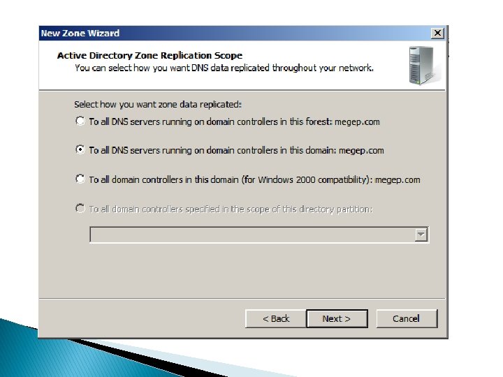 Active Directory ile tümleşik bir bölge oluşturduysanız, çoğaltma kapsamını belirtin ve Next’e tıklayın. Aşağıdaki seçenekler bulunur: � To All DNS Servers In This Forest: Bölge bilgilerinin Active Directory ormanındaki tüm etki alanlarına çoğaltılmasına olanak sağlar. Ormandaki tüm DNS sunucuları, bölge bilgilerinin bir kopyasını alır ve çoğaltma aracılığıyla güncelleştirmeleri edinir. � To All DNS Servers In This Domain: Geçerli etki alanındaki bölge bilgilerinin çoğaltılmasına olanak sağlar. Etki alanındaki tüm DNS sunucuları, bölge bilgilerinin bir kopyasını alır ve çoğaltma aracılığıyla güncelleştirmeleri edinir. � To All Domain Controllers In This Domain: Bölge bilgilerini Active Directory ormanındaki tüm etki alanı denetleyicilerine çoğaltır. Windows 2000 etki alanında olduğu gibi, tüm etki alanı denetleyicileri DNS Server hizmetini kullanıp kullanmadıklarına bakılmaksızın bölge bilgilerinin bir kopyasını alır ve çoğaltma aracılığıyla güncelleştirmeleri edinir.