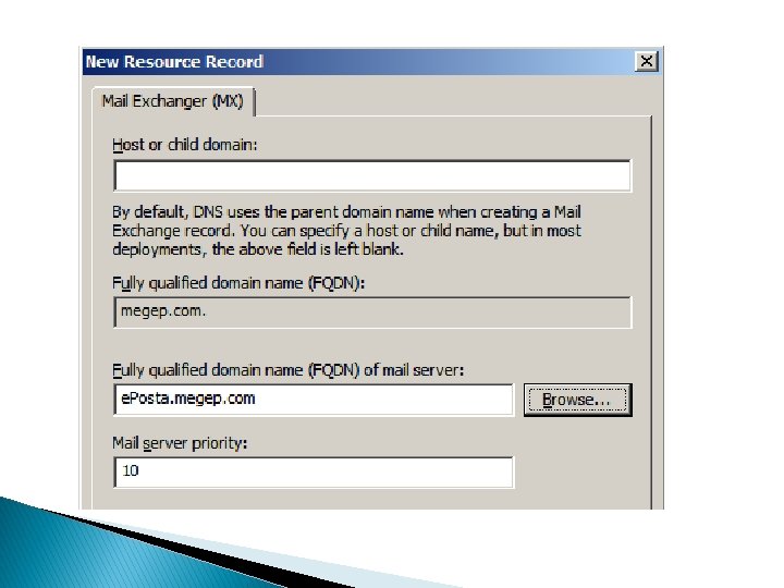 Mail Exchanger (MX) Kayıtları � � � Mail Exchanger (MX–Posta Ulaştırıcısı) kayıtları, etki alanına gelen e-postaların doğru posta sunucularına teslim edilmesini sağlayan bir posta ulaştırıcı sunucusu atar. Örneğin megep. com etki alanı için bir MX kaydı ayarlanmışsa, kullanıcıadı@megep. com adresine gönderilen tüm postalar MX kaydında belirtilen sunucuya yönlendirilir. Bir MX kaydını aşağıdaki adımları tamamlayarak oluşturabilirsiniz: DNS konsolunda, birincil ad sunucusunun düğümünü ve sonra da ilgili Forward Lookup Zones klasörünü genişletin. Kayıt eklemek istediğiniz etki alanını farenin sağ düğmesiyle tıklayın ve New Mail Exchanger (MX) seçeneğini belirleyin. Host Or Child Domain kutusunu boş bırakın. Boş girdi, posta ulaştırıcısının hizmet ettiği etki alanının ana etki alanı adıyla aynı olduğunu belirtir ve bu genellikle istenen bir durumdur.