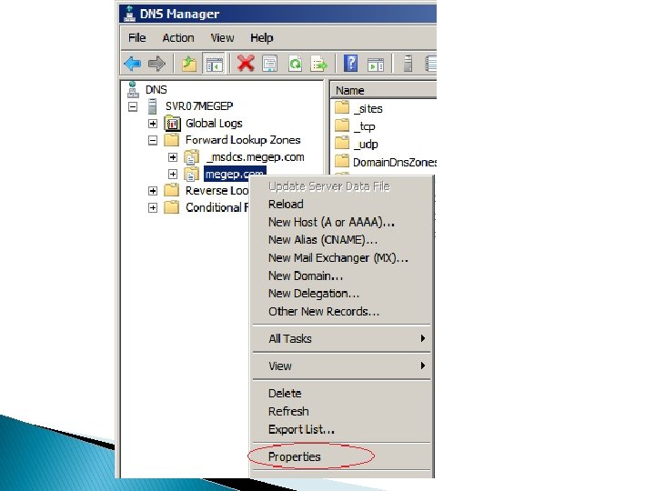 Canonical Name (CNAME) Kayıtları � � � Canonical Name (CNAME–Diğer Ad) kayıtları, bilgisayar adları için kolay adlar oluşturur. Böylece, bilgisayara DNS’de birden çok adla başvurulabilir. En genel kullanımı, bir bilgisayarın World Wide Web (WWW) ya da File Transfer Protocol (FTP) gibi bir ortak hizmeti sağlamasıdır ve bu durumda karmaşık bir ad yerine bir kolay ad kullanılması tercih edilir. Örneğin svr 07 megep. com adlı ana bilgisayar için www. megep. com kullanmayı tercih edebilirsiniz. Bilgisayar adı için DNS konsolundan bir diğer ad oluşturmak için birincil ad sunucusunun düğümünü ve sonra da ilgili Forward Lookup Zones klasörünü genişletin. Kayıt eklemek istediğiniz etki alanını farenin sağ düğmesiyle tıklayın ve New Alias (CNAME) seçeneğini belirleyin.