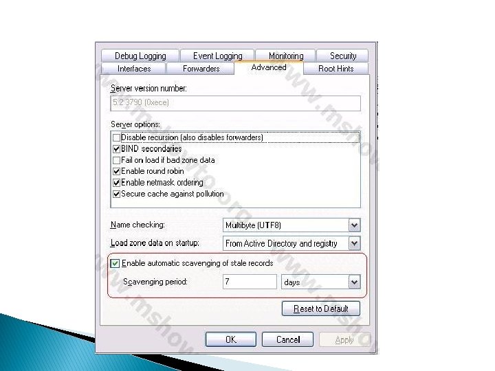 DNS Scavenging (Temizleme) � � Dinamik update özelliği ile birlikte, istemcinin dns kaydı (Resource Record-RR) DHCP tarafından veya belli periyodlar ile istemci tarafindan (dnsclient servisi) güncellenir. Fakat dinamik olarak yaratılmış bu kayıtlar, istemcinin ağa uzun süre veya bir daha hiç dahil olmayacağı durumlarda otomatik olarak silinemez. Bu yanlış kayıtlar DNS üzerinde yer kaplamasının yanında sorgularda olmayan makineleri döneceği icin zamanla baş ağrıtır ve dns performansını düşürür. Öncelikle DNS’in aging/scavenging özelliğini doğru bir sekilde kullanabilmek için kayıtlarınızın dinamik olarak güncelleştirilebiliyor olması gerekiyor. Dinamik güncelleştirmenin kapalı olduğu zone’lar ve manuel yaratılan kayıtlar için bu mekanizmayı kullanamazsınız. DNS’in bu özelliğini verimli olarak kullanabilmek için terminolojisini de iyi anlamak gerekiyor.