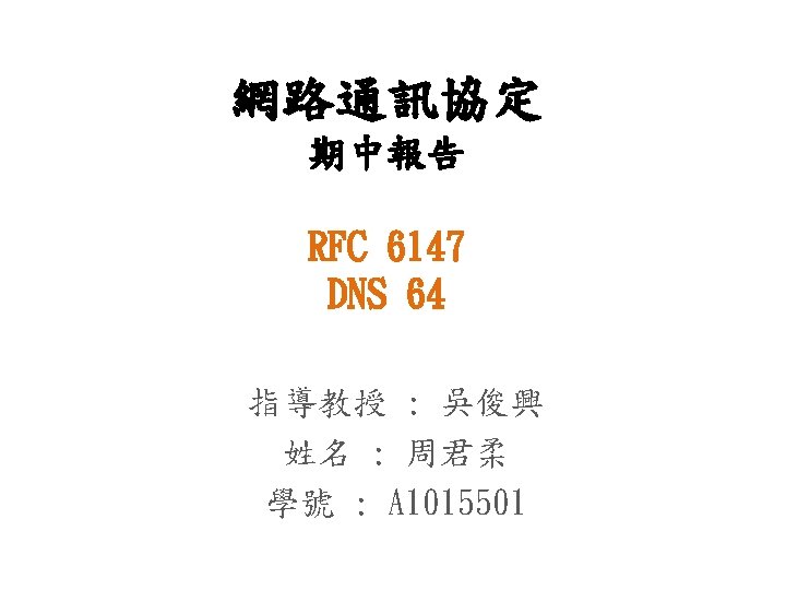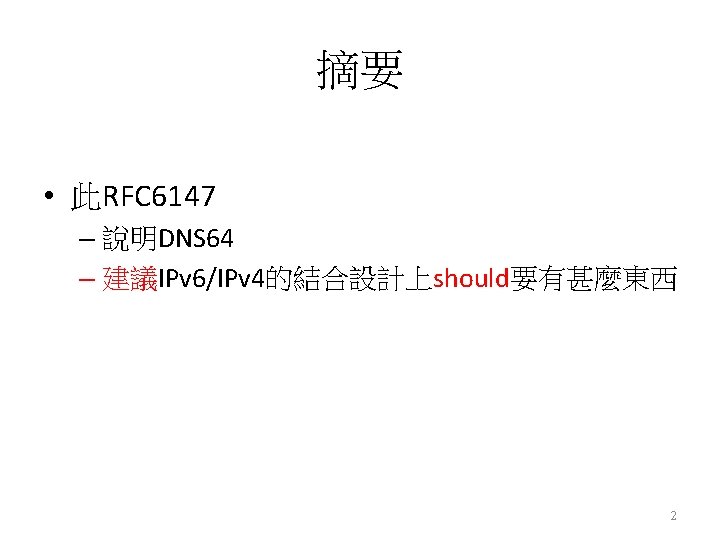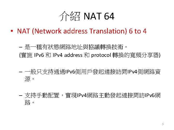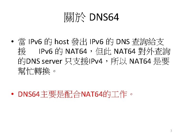 介紹 DNS 64 • DNS (Domain Name System) 6 to 4 – 主要是配合NAT 64的 作。 – 更改部分的DNS message。 – 進行prefix合成 : 把A record 合成 AAAA records。 – 使 IPv 6 -only client 和 IPv 4 -only server之間做通訊。 – 可能實作在 : • Server : Authoritative name server • local server(Resolover): – Stub resolver、Recursuve resolver • host 6
