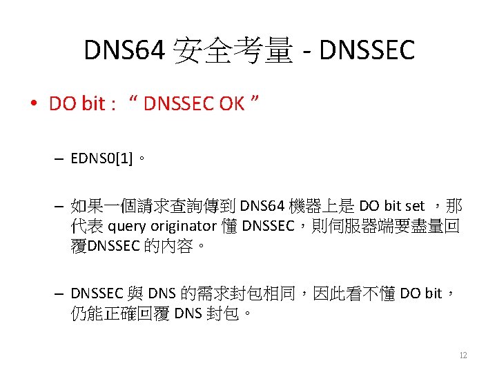 DNS 64 安全考量 - DNSSEC • DNSSEC (The Domain Name System Security Extensions) – DNSSEC在設計上即為DNS的安全性延伸標準。 – 與DNS相容性的問題。 – Port 53 同DNS。 – 53 UDP 供客戶端與伺服器端溝通。 – 53 TCP 則供伺服器間溝通。 – Signaling bits : DO 、 AD 、CD 11