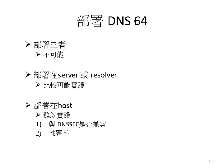 IPv 6 - only host IPv 4 - only server NAT 64 (Query Agent) => 進行address和protocol 的轉換 IPv 4 DNS Query / Reply IPv 4 DNS Server 8
