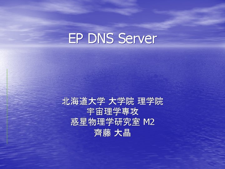 参考資料 • • • Paul Albitz 他著 「DNS & BIND 第 3 版」 (O’REILY JAPAN) EP DNS サーバ構築ドキュメント (http: //www. ep. sci. hokudai. ac. jp/~epdns/dvlop/bind) @IT [BIND でつくる DNS サーバ, 他] (http: //www. atmarkit. co. jp/flinux/rensai/bind 01. html ) IT 用語辞典 e-words (http: //e-words. jp/) 2006 年度 06/16 座学編 「DNS ってなんでしょう?」 (岩堀 智子) (http: //www. ep. sci. hokudai. ac. jp/~epnetfan/zagaku/2006/0616/pub/ ) 2007 年度 06/01 座学編 「DNS」 (土屋 貴志) (http: //www. ep. sci. hokudai. ac. jp/~epnetfan/zagaku/2007/0601/pub/ )