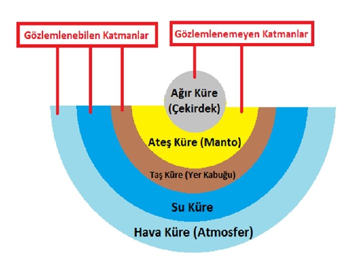 • Bu katmanlardan • Hava küre(Atmosfer), su küre ve taşküre, Dünya’mızın gözlemlenen, • Ateş küre ve ağır küre ise gözlemlenemeyen katmanlarıdır. •