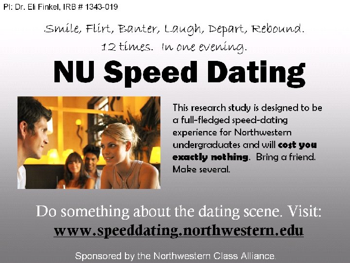 Method – Speed-dating o o o 163 Northwestern undergraduates Completed a 30 -minute background questionnaire online prior to the event Met 9 -13 opposite sex individuals for 4 minutes each n o Completed a ~2 minute questionnaire after each date After returning home, participants “yes” or “no” the other participants online n “Matches” can email one another through web portal
