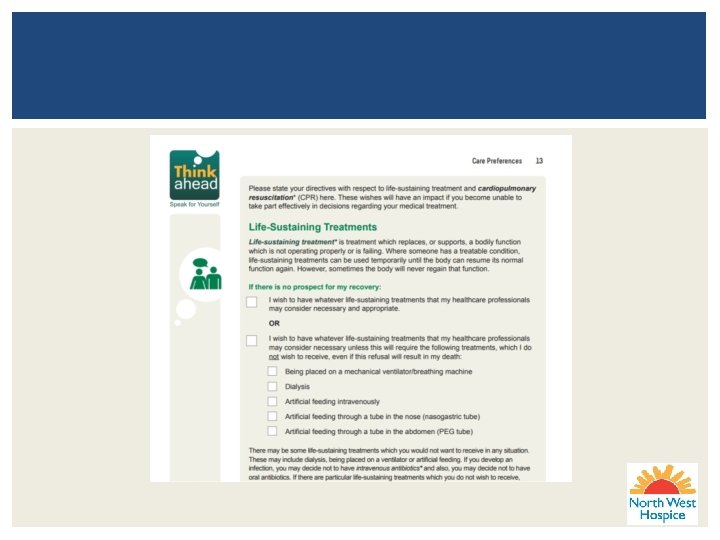 ADVANCE HEALTHCARE DIRECTIVES Decisions on future medical treatment in writing and witnessed. A person will be able to revoke an AHD at any time – verbally or in writing. No-one will be under any obligation to create an AHD ‘designated healthcare representative’- acting on the person’s behalf at a time when they lose capacity. also be given a general power to consent to and to refuse treatment up to and including the refusal of life-sustaining treatment An AHD only comes into force when a person loses capacity and cannot make a decision. An AHD provides clarity § Healthcare professionals to care for a person § Family