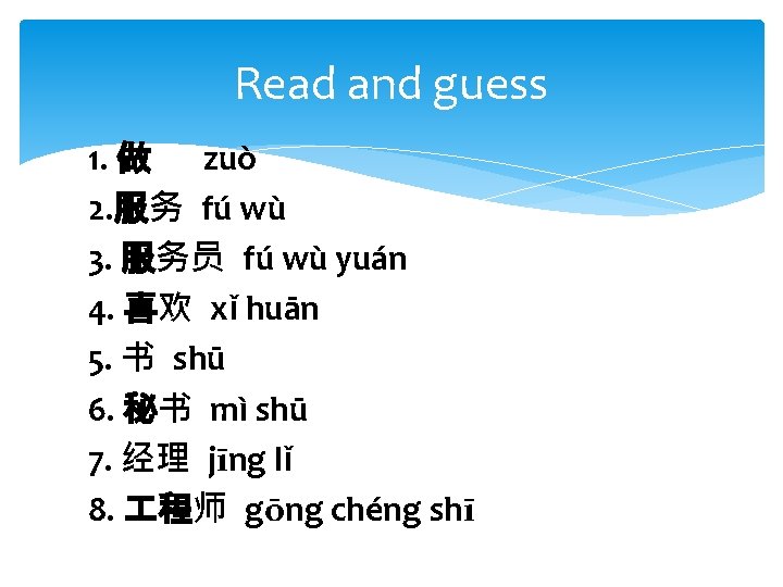 Check your memory Say the words in Chinese and write down the pinyin 1. make; do 2. attendant 3. like; be fond of 4. secretary 5. manager 11. engineer